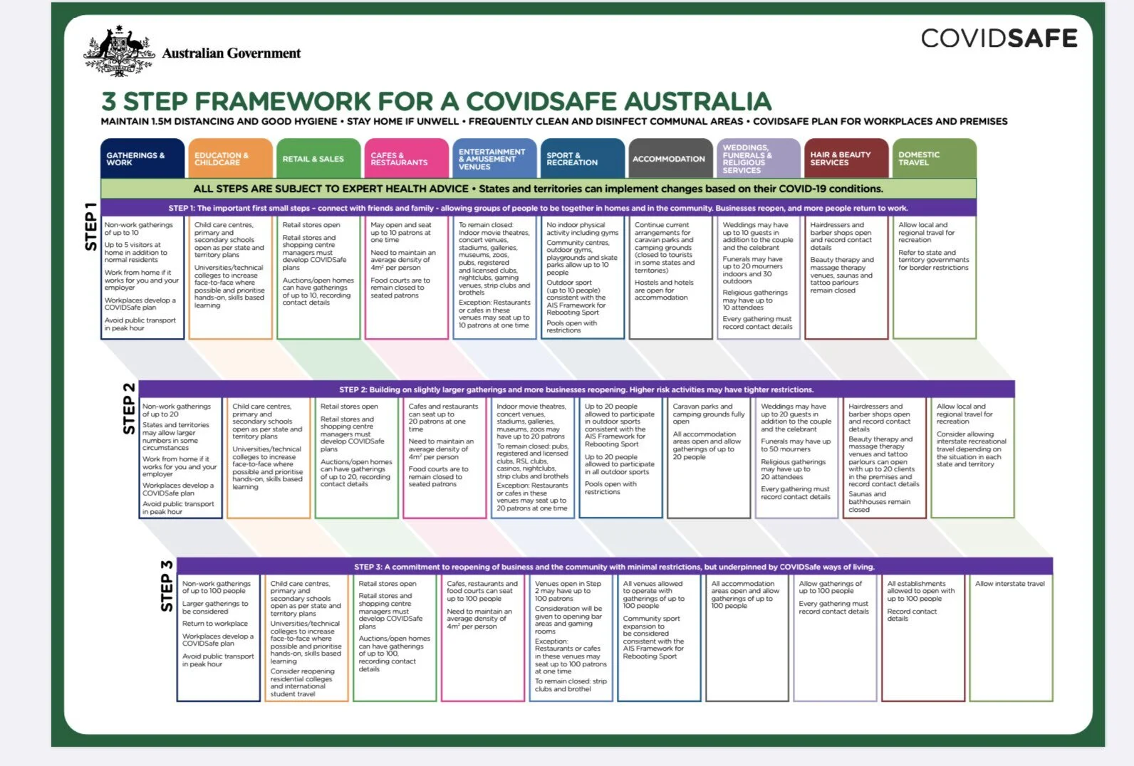 The Prime Minister today announced a 3-Step Framework for getting the country back to work and towards normal life. It will remain for States to determine the detail on relaxing restrictions, but the National Cabinet - including State and Territory leaders - has agreed that this framework will form the basis of the process.